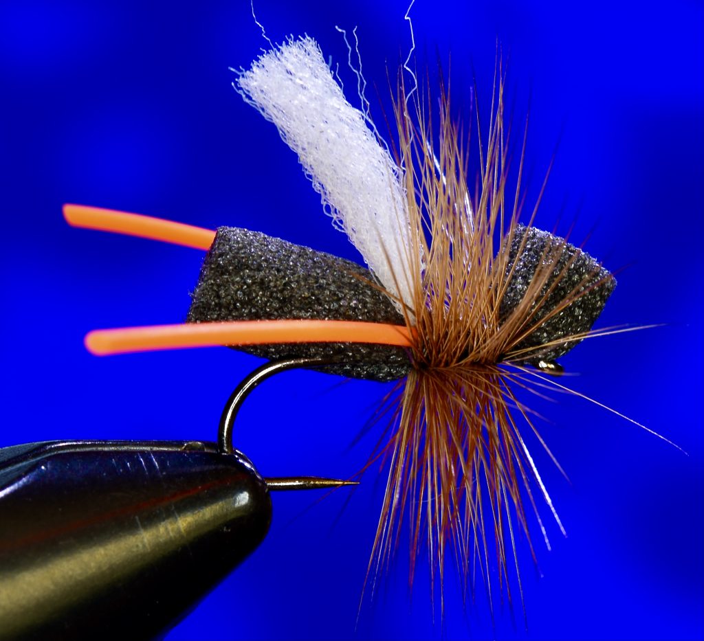 Foam Ant. Haken: Trockenhaken Gr. 12 bis 18; Bindeseide: schwarz; Abdomen und Thorax: Foam, schwarz, über Straußengras, schwarz; Hechel: Hahn, schwarz. Schwimmt sehr gut.
