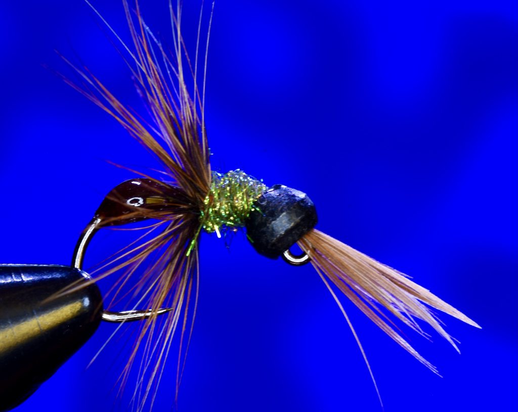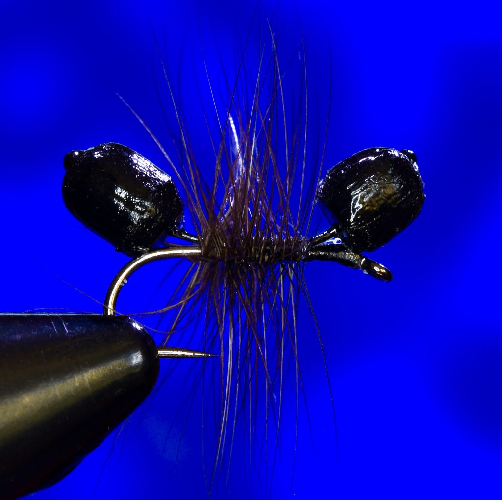 Drowned Ant. Haken: Gr. 12 bis 16; Bindeseide: braun; Kopfperle: Tungsten, schwarz; Fühler: Hechelfiber, braun; Hinterkörper: Floss oder Bindeseide, braun, UV; Hechel: Henne, braun; Thorax: Dubbing, peacock. Sehr neu, sehr clever.