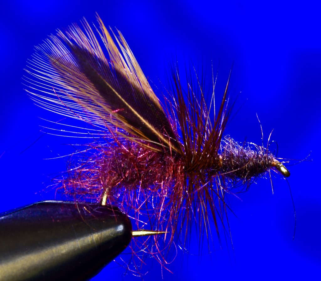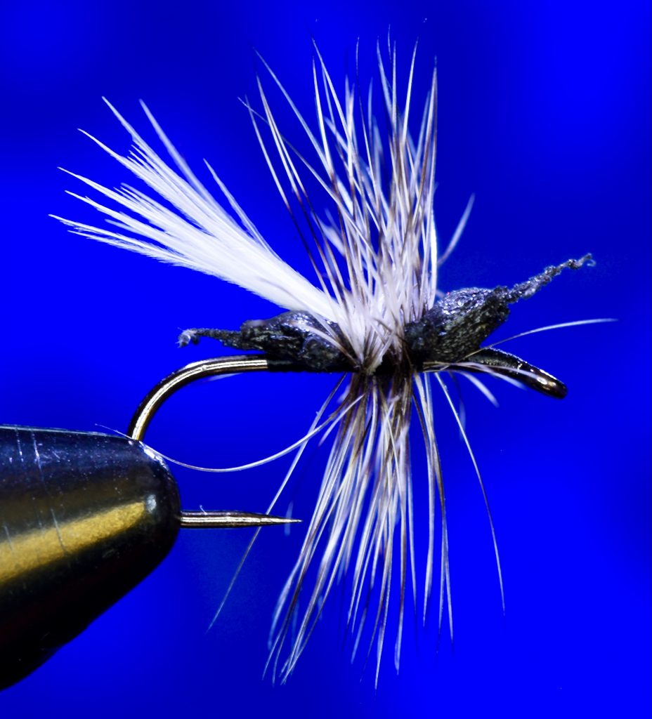 FLA. Front Loader Ant. Haken: Trockenhaken Gr. 12 bis 18; Bindeseide: braun; Abdomen: Dubbing, braun; Flügel: CDC, Polypropylen in Sichtfarbe; Thorax: Dubbing, dunkelbraun; Hechelträger: Flexyfloss; Hechel: Hahn, grizzlybraun. Komplexe Bindeweise, aber lohnend.