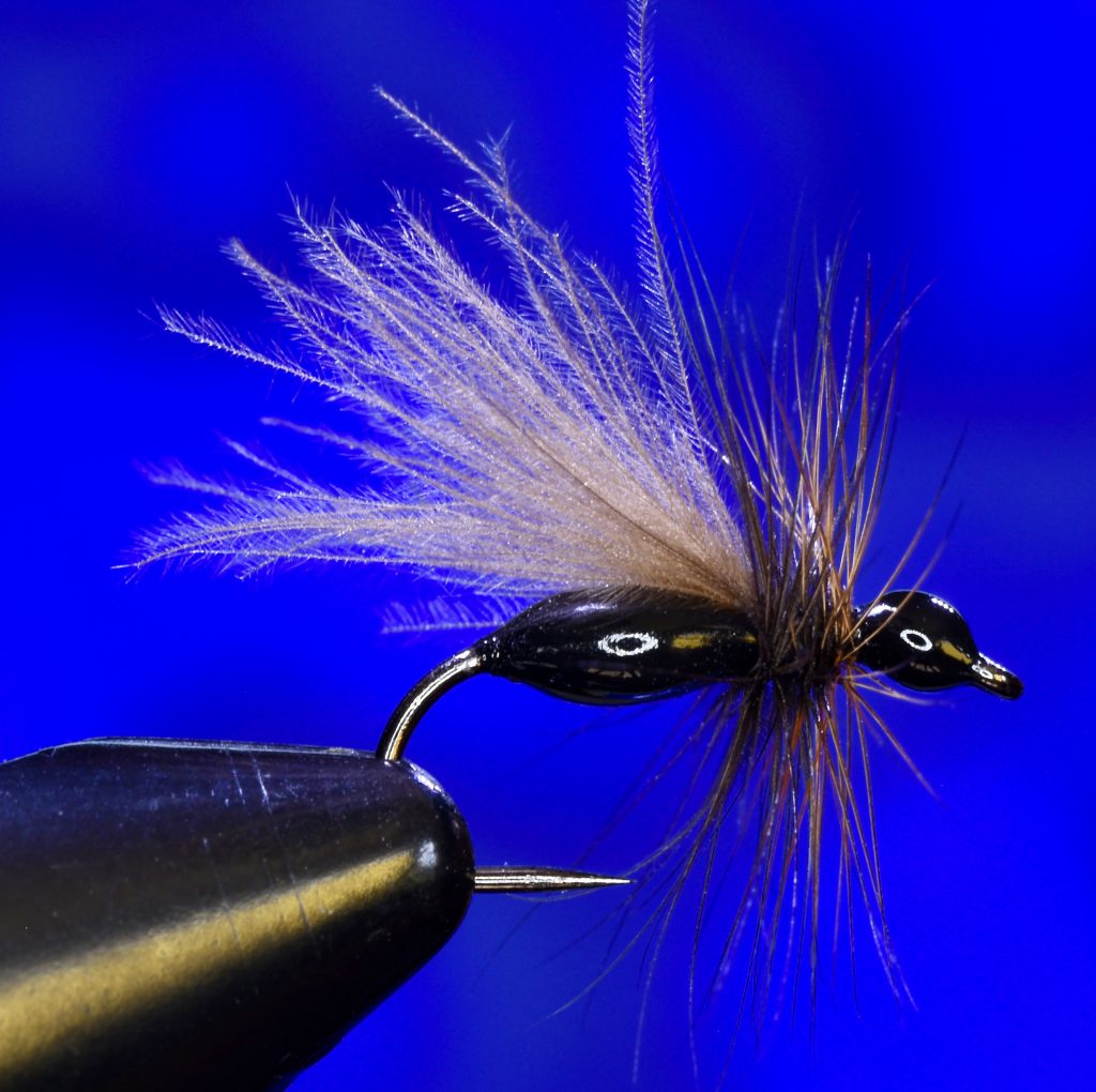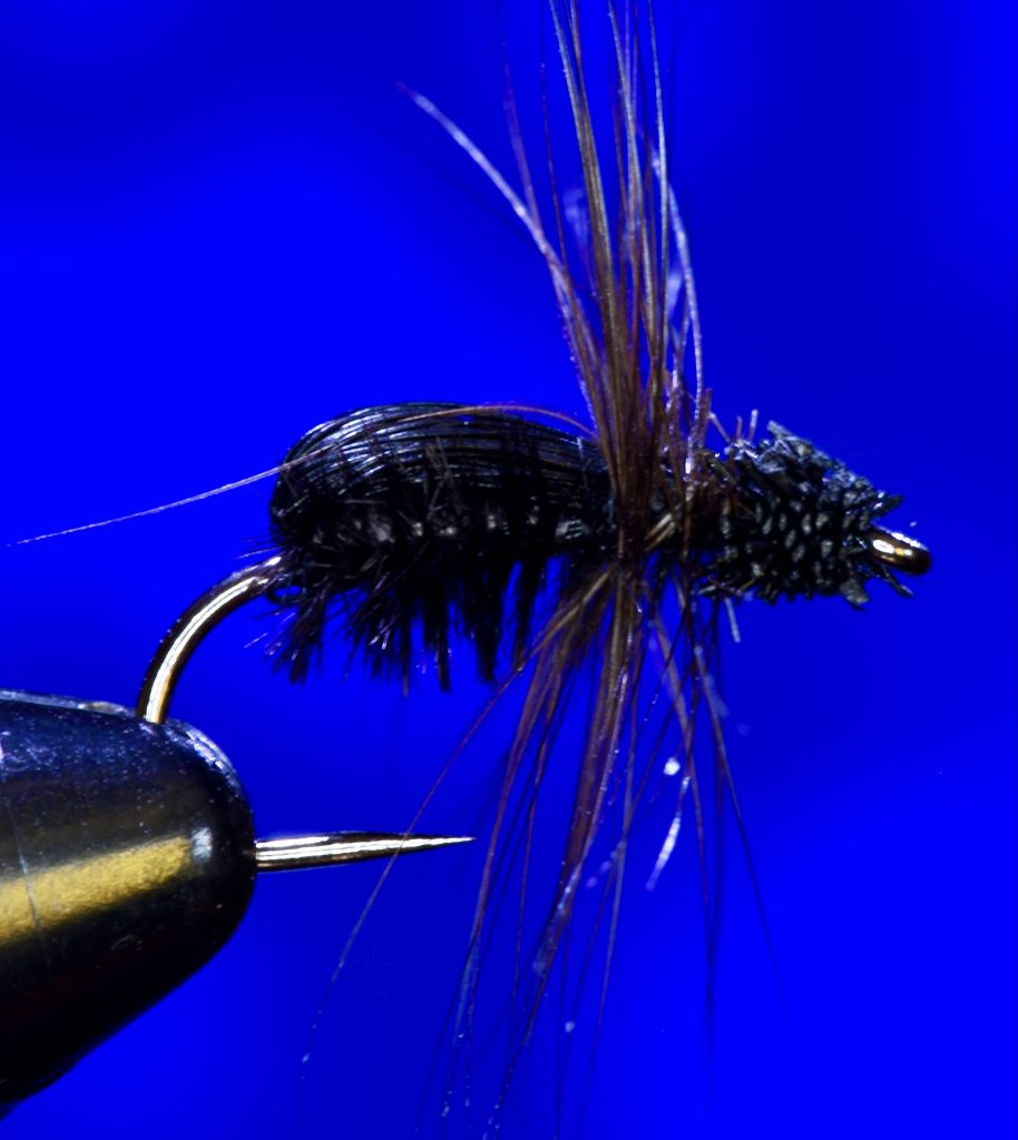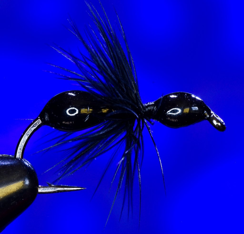 Tactical Ant. Haken: Trockenhaken Gr. 12 bis 18; Bindeseide: schwarz; Körper: Floss, schwarz, UV; Flügel: CDC, natur; Hechel: Hahn, braun. Sieht trocken aus, schwimmt aber eher nicht.