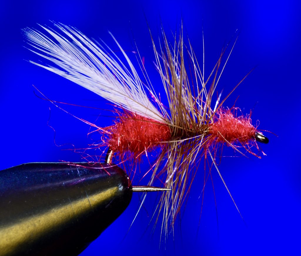 Red Flying Ant. Haken: Trockenhaken Gr. 12 bis 18; Bindeseide: rot; Abdomen: Dubbing, rot; Flügel: 2 Hechelspitzen, weiß; Hechel: Hahn, braun; Thorax: Dubbing, rot. Lässt man die Flügel weg, hat man eine „Fur Ant“.