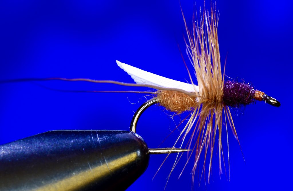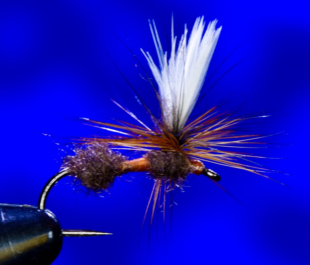 Parachute Ant. Haken: Trockenhaken Gr. 12 bis 18; Bindeseide: braun; Abdomen: Dubbing, braun; Flügel: Turkey Flat Fibern, weiß: Hechel: Hahn, braun, Parachute gebunden; Thorax: Dubbing, braun. Oft die beste Bindeweise.