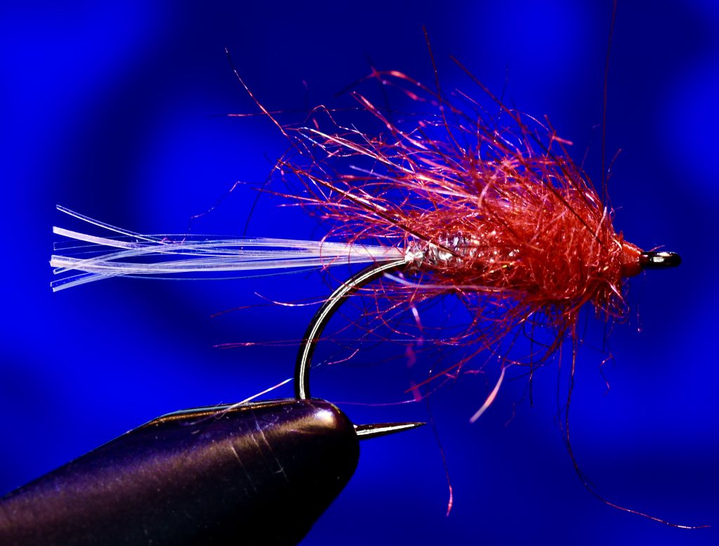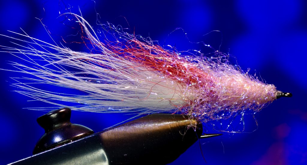 Shrimp. Auch ein 10er Haken. Hinten weißes Marabou, dann etwas rotes Dubbing, vorn Icedub in zartem Rosé. Ebenfalls sehr leicht und beweglich. Ideal wenn sich seichtes Wasser aufwärmt.