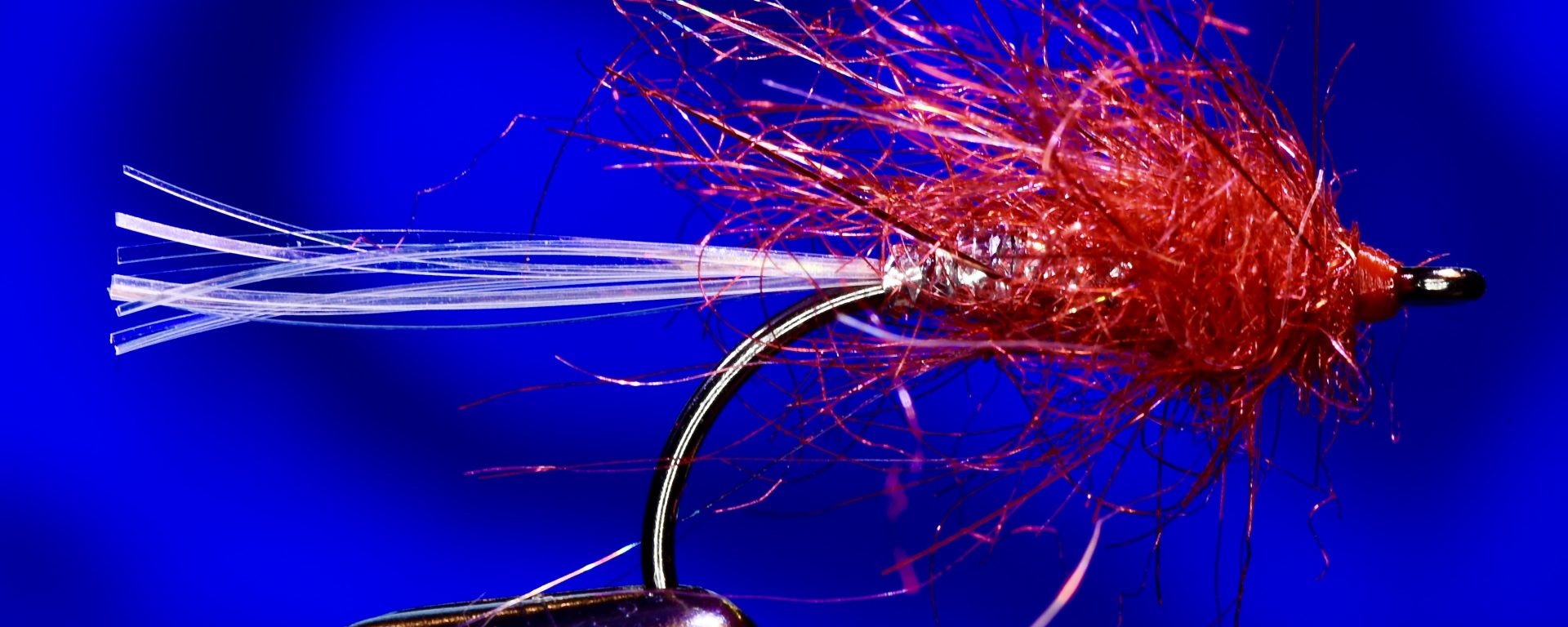 Fry. Der Haken ist ein 10er. Schwanz aus Pearlflashabou, Hinterkörper Silberbraid, Thorax rotes Dubbing. Sehr klein und leicht, ideal für flaches Wasser und trotzdem auffällig wie ein bunter Hund.