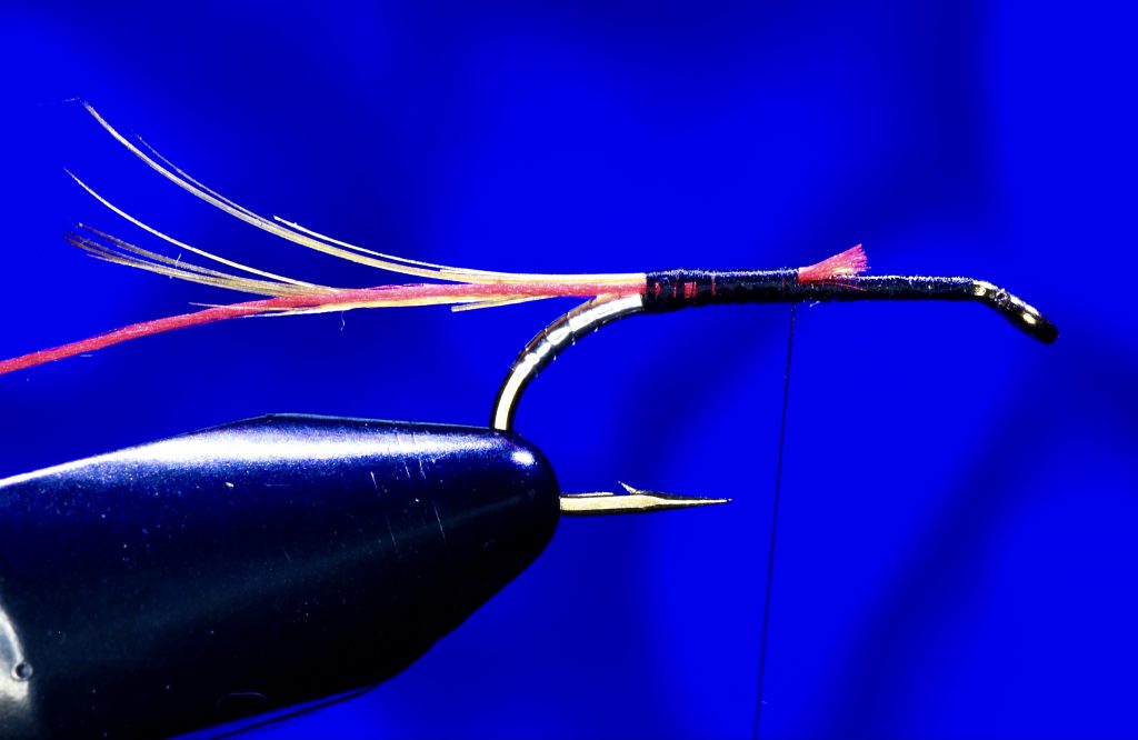 Dem 8er Haken der Wahl ein Fundament winden und mit Flachsilber ein Tag, Anhängsel, anlegen. Eine vergleichsweise lange Crestfeder als Schwanz einbinden. Durch die Länge entsteht der Streamereindruck. Länge läuft.